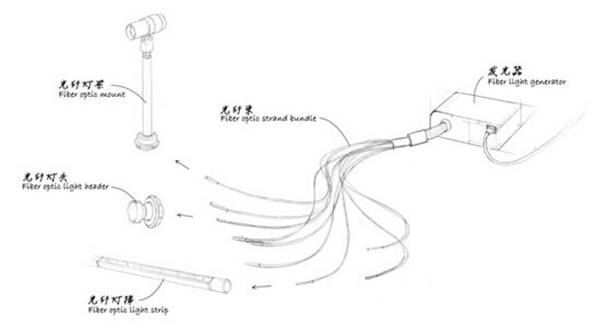 重点照明的首选。从二十世纪九十年代光纤照明系统进入博物馆,到目前的快速普及应用,是由于光纤照明系统的以下优势:这个系统由三个基本部件组成,发光器(卤素光源、金卤光源、LED光源)、玻璃光纤束、尾件灯头;发光器可置于展柜外远离展品的任意位置,因此它产生的热量不会对展品造成影响;光纤束传导可见光不传导紫外光,因此从灯头射出的光不含紫外光,也不携带光源的热量;灯头的数量和位置可以任意组合,以达到最佳的照明效果;灯头的出光角度及方向灵活可调,满足不同类型、不同尺寸展品的照明要求;除金卤光源外,其他两种光源均可进行照度调节。